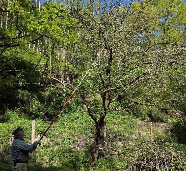 Unter fachkundiger Anleitung von Herrn Gerlach vom LOGL Hessen (Landesverband für Obstbau, Garten und Landschaftspflege e. V.) erhielten wir wertvolle Einblicke in den richtigen Schnitt alter Obstbäume. Zwei Apfelbäume standen zwar bereits in voller Blüte, konnten aber dennoch gut bearbeitet werden. Zuvor war ein Einsatz aufgrund der Krötenwanderung nicht möglich gewesen – ein wichtiger Beitrag zum Naturschutz, den wir selbstverständlich berücksichtigt haben.